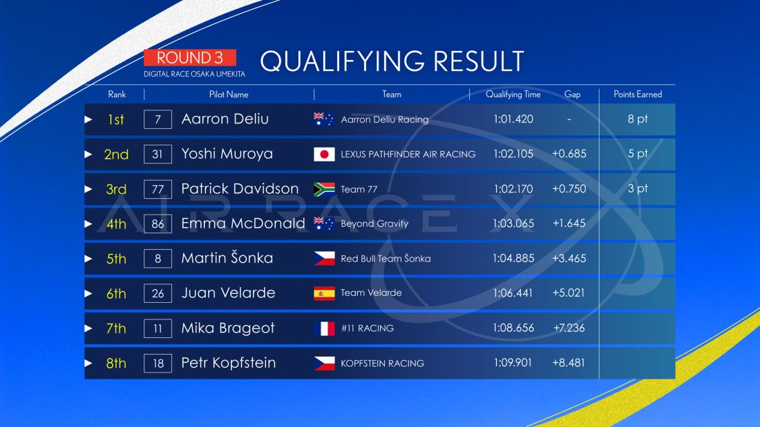 室屋は「空気の密度が低い条件では不利もあったが、タイムを揃えられなかったのは自分に足りない部分。それでも、2戦連続でトラックレコードをマークしているように、機体の速さは十分ある。より安定して発揮できるようにトレーニングを続けたい」と語った。